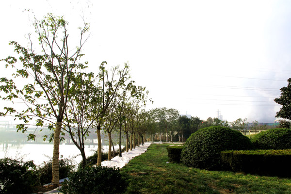 圖一:為構建一條公司及周邊區域的綠色屏障,六國公司在東門套湖周邊移植楊柳、廣玉蘭等花木,并對損壞草坪進行養護、修復。