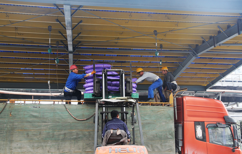 圖為工人正在將六國化肥裝運到來廠自提化肥的大貨車上。為確保化肥裝運作業安全,近日,六國化工公司安全環保部在磷酸二銨、復合肥、磷酸一銨提貨處汽車裝卸平臺的3個鋼棚加設安全帶懸掛設施,要求工人在登高裝運化肥時,規范佩戴安全帶。同時,該公司安全環保部、營銷公司發貨現場等落實好叉車倒轉、化肥裝運過程中的安全監管,保衛部做好廠內交通安全提示和管理等工作。( 陳沐 張紅麗)