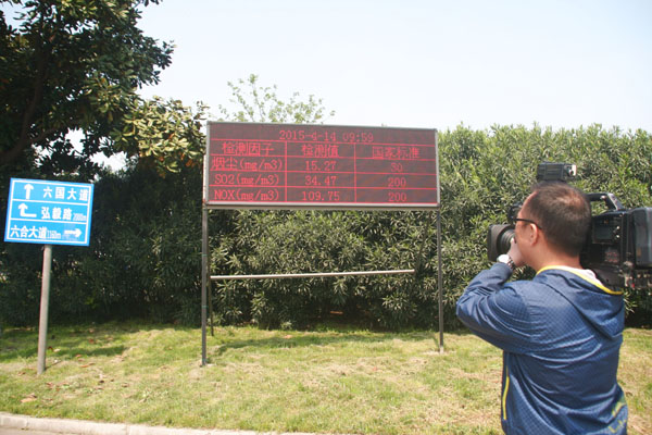 圖為4月14日,銅陵市電視臺記者來六國化工公司取景拍攝,制作全市工業企業貫徹實施新《環境保護法》情況的電視新聞報道。當天,六國化工公司的二氧化硫、氮氧化物、粉塵等主要污染物排放數據低于國家規定的排放限值。近年來,該公司在持續開展環境綜合整治、提升企業環保和清潔文明生產水平的同時,完善環保在線監測系統,并在廠外設置LED顯示屏,實時發布環保在線監測數據信息,自覺接受社會公眾和媒體的監督。( 陳沐)