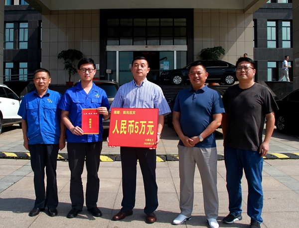 圖為六國化工總經理馬健、黨委副書記吳健向郊區(qū)灰河鄉(xiāng)捐贈5萬元防汛救災資金