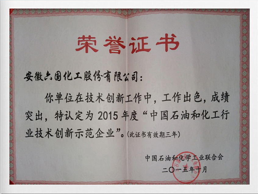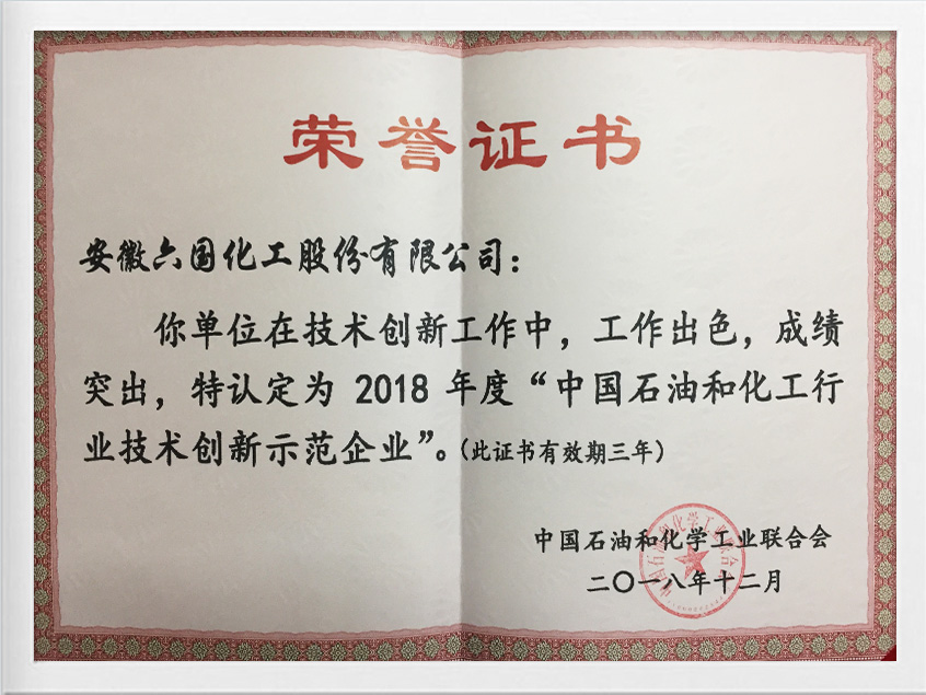 中國(guó)石化行業(yè)技術(shù)創(chuàng)新示范企業(yè)證書2018年